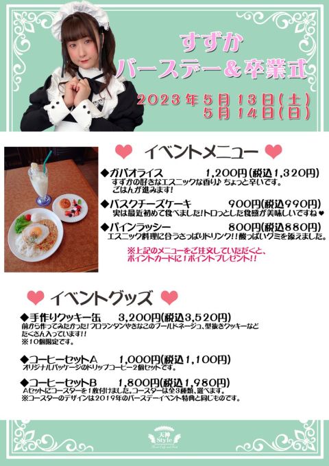 通常のメイド服ではなく、特別衣装でのお給仕となりますので、ご注意ください😊