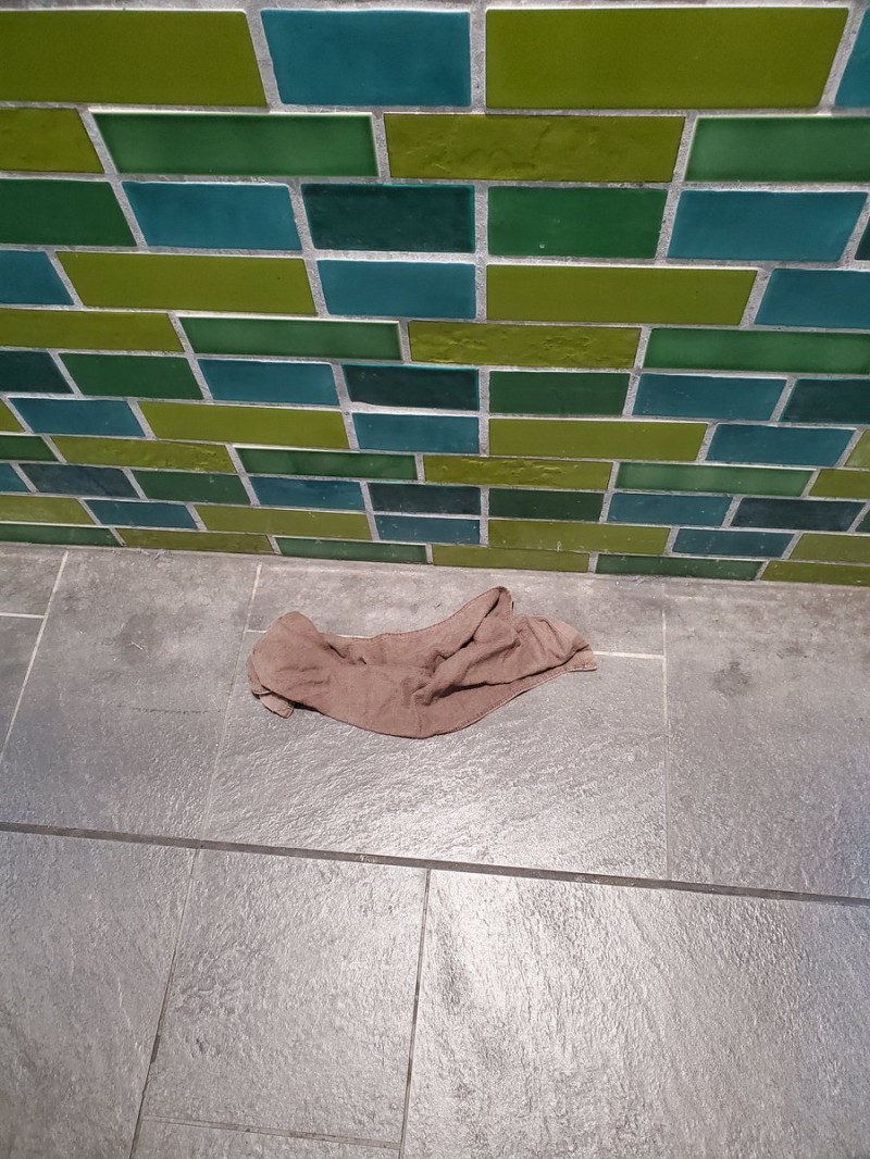 連絡通路に店のタオル!