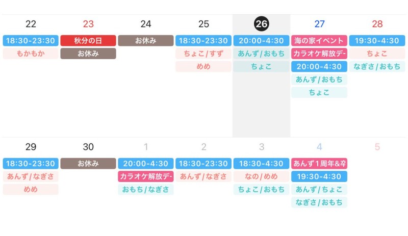 | 営業時間 | 月〜木18:00~23:30 金18:00~5:00 土17:00~5:00 日17:00~23:30 | ||||||||||||||