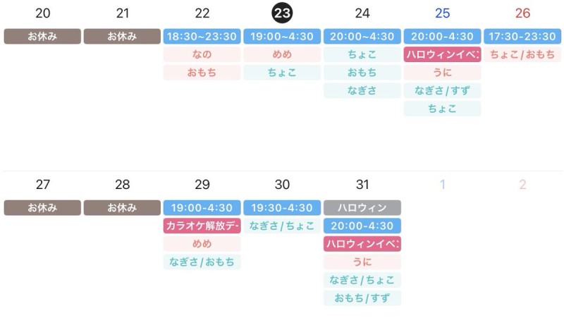 | 営業時間 | 月〜木18:00~23:30 金18:00~5:00 土17:00~5:00 日17:00~23:30 | ||||||||||||||