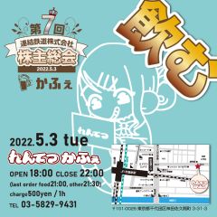 | 営業時間 | 平日 18:00〜23:00(ラストオーダー22:30) 土日祝 不定期営業(Twitterにて情報更新) https://twitter.com/renketsutetsudo 乗務員のシフトはWEBより確認頂けます。 https://rentetsu.net/shift/ | ||||||||||||||