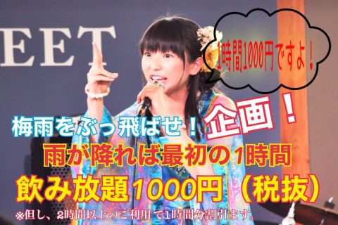 雨が降ってる日は最初の1時間1000円(税別)飲み放題!