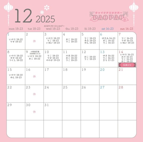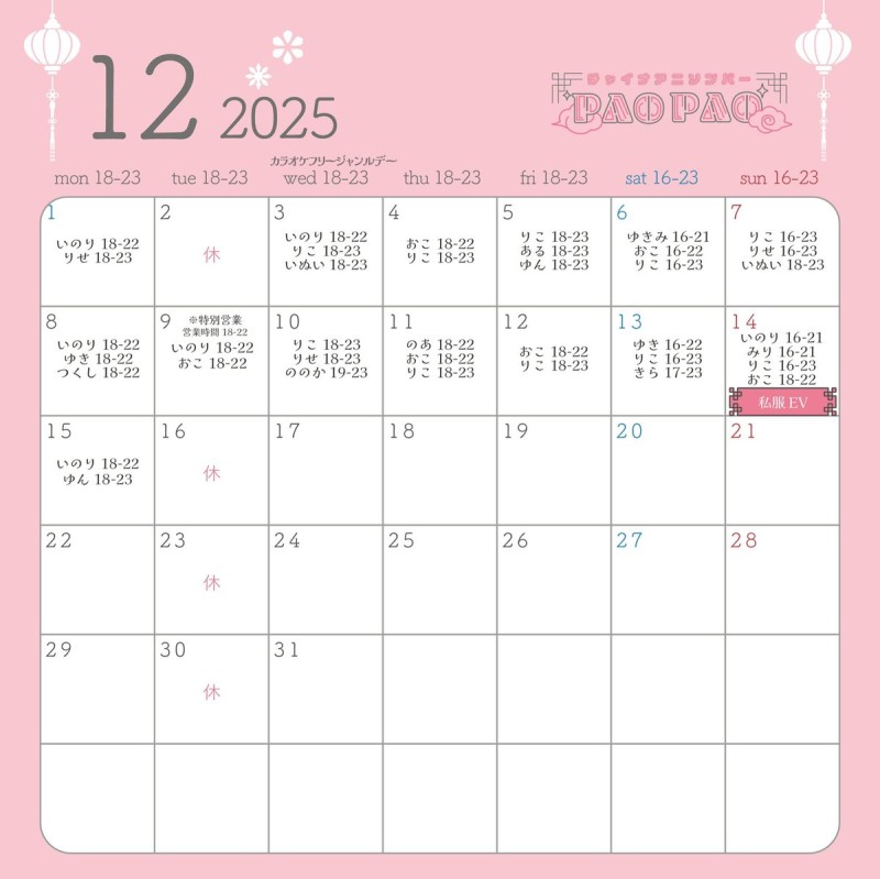 🐼12月の予定🐼 🎤毎週水曜日カラオケフリージャンルデー 【イベント】 14日私服EV 24~28日クリスマスEV🎄 31日年越し🎍 ※詳細は画像をご覧ください ⚠️店休日:毎週火曜 ✨キャスト募集中✨🔽詳細 🎀姉妹店🎀 @melfi_maid 予定変更やイベント詳細はスレッドにて🔽 https://t.co/oQek7UvlHY